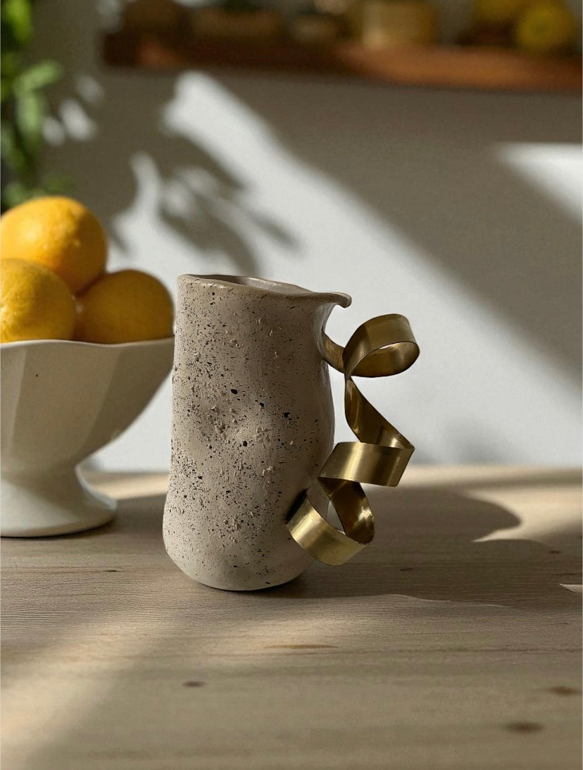 Le métal ajouté vient s'inspirer d'un pétale de pivoine, une forme délicate et fluide qui contraste avec la texture organique de la terre.