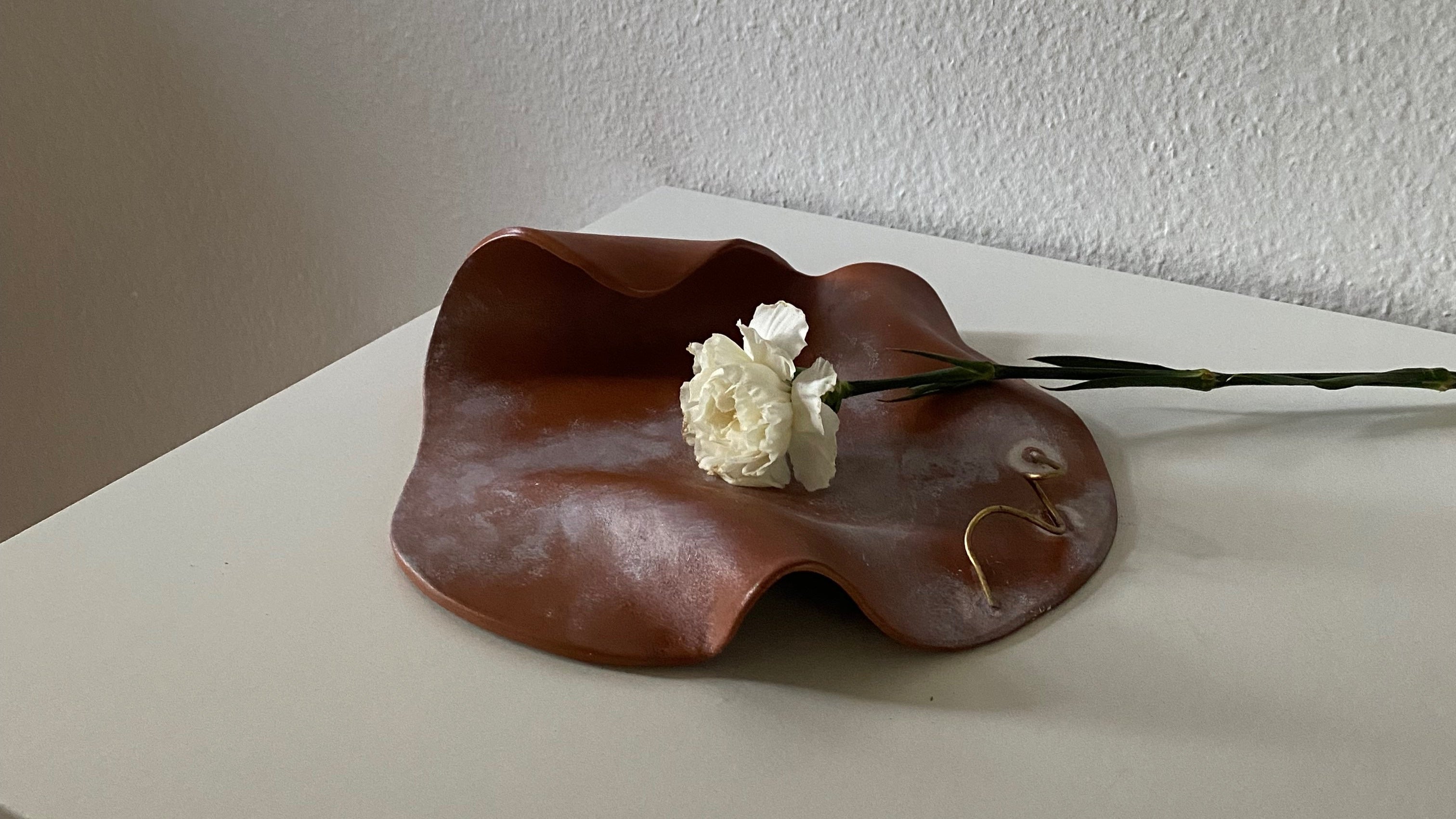 Le métal ajouté vient s'inspirer d'un pétale de pivoine, une forme délicate et fluide qui contraste avec la texture organique de la terre.