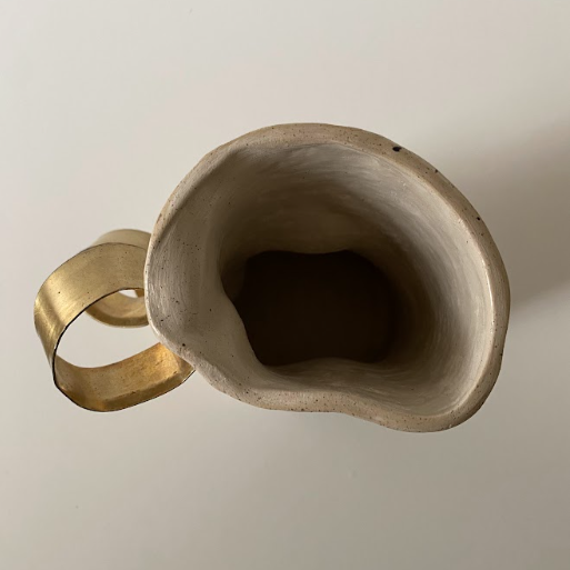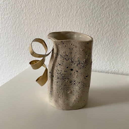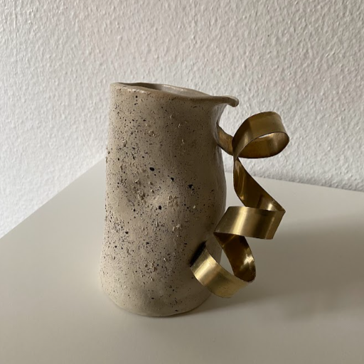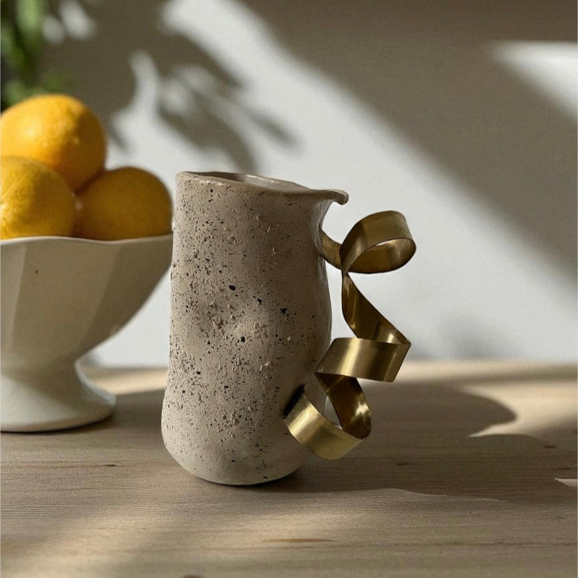 Ce vase sculptural joue la carte du contraste : la sobriété du grès brut se mêle à la sophistication d’un ruban doré, presque architectural. Une pièce minimaliste, contemporaine, à forte présence.